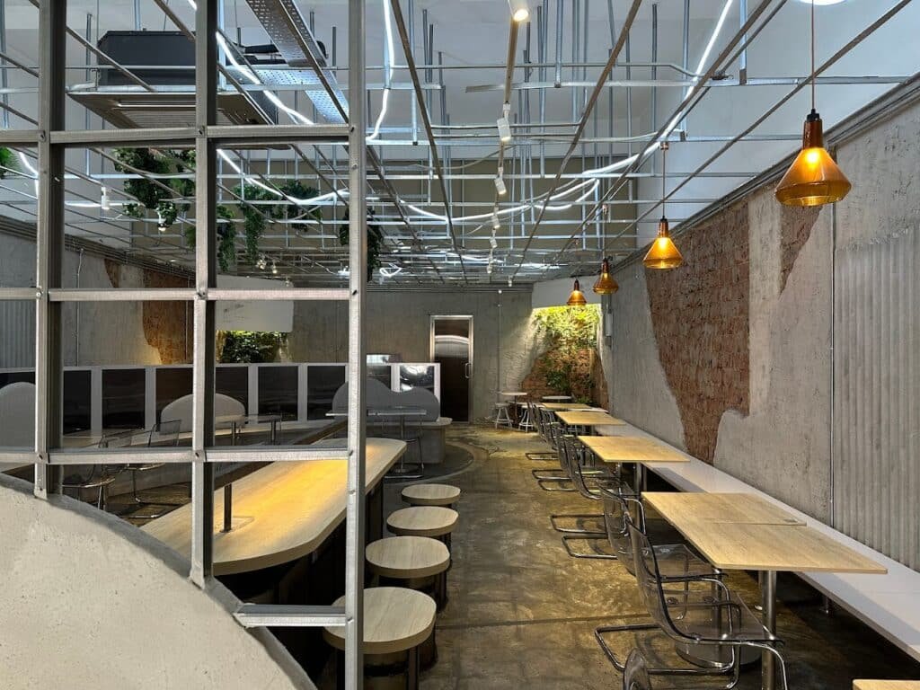 隐藏在五福城商区的「 酉 BY JWC 」,是一间新概念店,一踏入就仿佛误闯进了一个废弃工厂。店内的装饰充满了工业风,每一处都透露着独特的工业美感。但这些冷硬的元素被角落里的绿色植物和温暖的灯光巧妙中和,营造出一种既有质感又富有温度的氛围。
