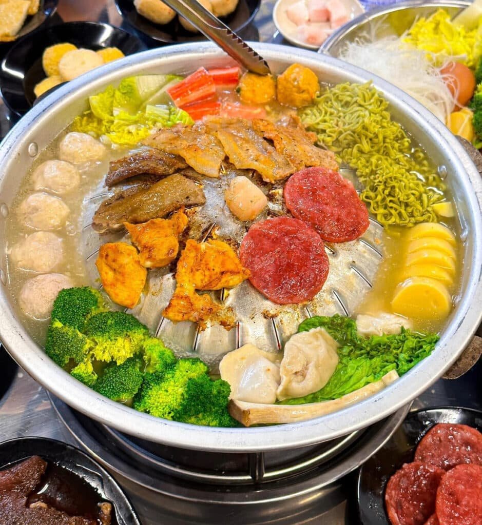 其高性价比的套餐是众所周知的,2至3人份的套餐仅需48马币,就可以享受到丰富多样的肉类选择,再加上无限量供应的冬粉和新鲜蔬菜。「 DND Thai Mookata Restaurant 」的特色在于使用炭火烹饪,这种传统方式让肉品散发出迷人的炭烤香气,同时保持肉质的鲜嫩多汁。餐厅提供多达九种口味的腌制猪肉和鸡肉片,包括原味、台湾甜酱、香辣味和黑胡椒等,每一片肉都经过精心腌制,确保每一口都是美味的享受。