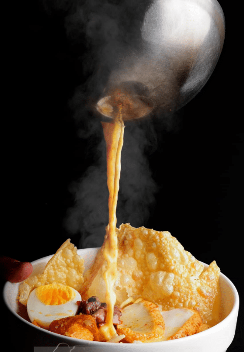但说到「 飞标粿条汤 」的魅力,并不止于此。他们的娘惹式叻沙,同样令人难以忘怀。制作这道菜的底料,每一步都显得那么精心,耗费上一整天的时间,仅用最真挚的香料,不容一丝杂质,确保每一口叻沙都是最地道、最新鲜的味道。而早上8点,这里的古早味炭烧面包更是人们的回忆。面包内裹着自家制的浓郁咖椰,配上那一大块冷冻牛油,每一口都是时间的回味,是新山的一份深深的怀旧。
