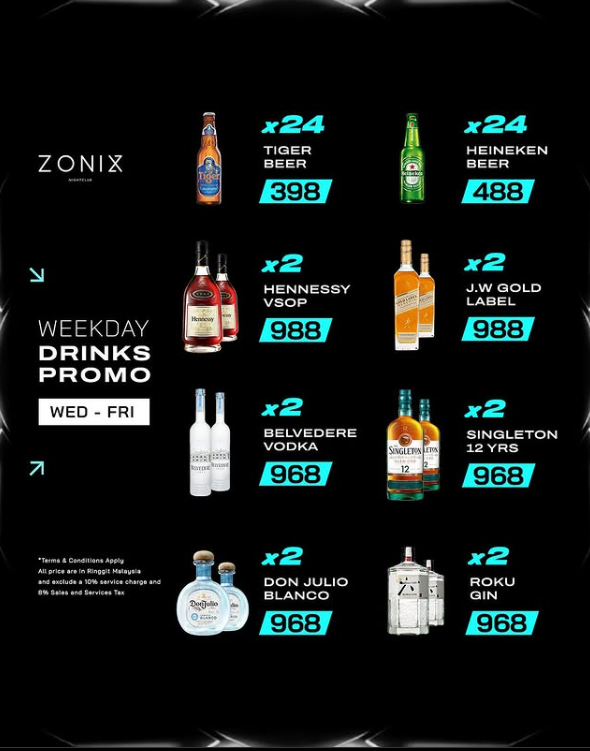 - Thursday: Free Flow Night — 女生RM58+,男生RM98+,畅饮到你爽到爆!