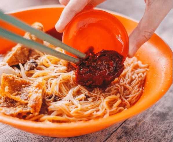 汤汁,是这碗叻沙的灵魂。老板特选老椰和虾米熬制,椰香四溢,混合着微微的海鲜甜味,既浓郁又温和。对于喜欢挑战味蕾的食客,还可以加入那诱人的叁巴辣椒酱,辣味立刻唤醒舌尖。豆芽、豆腐卜、鱼蛋、血蛤和鹌鹑蛋为其增添了丰富的口感,正是老派的经典。